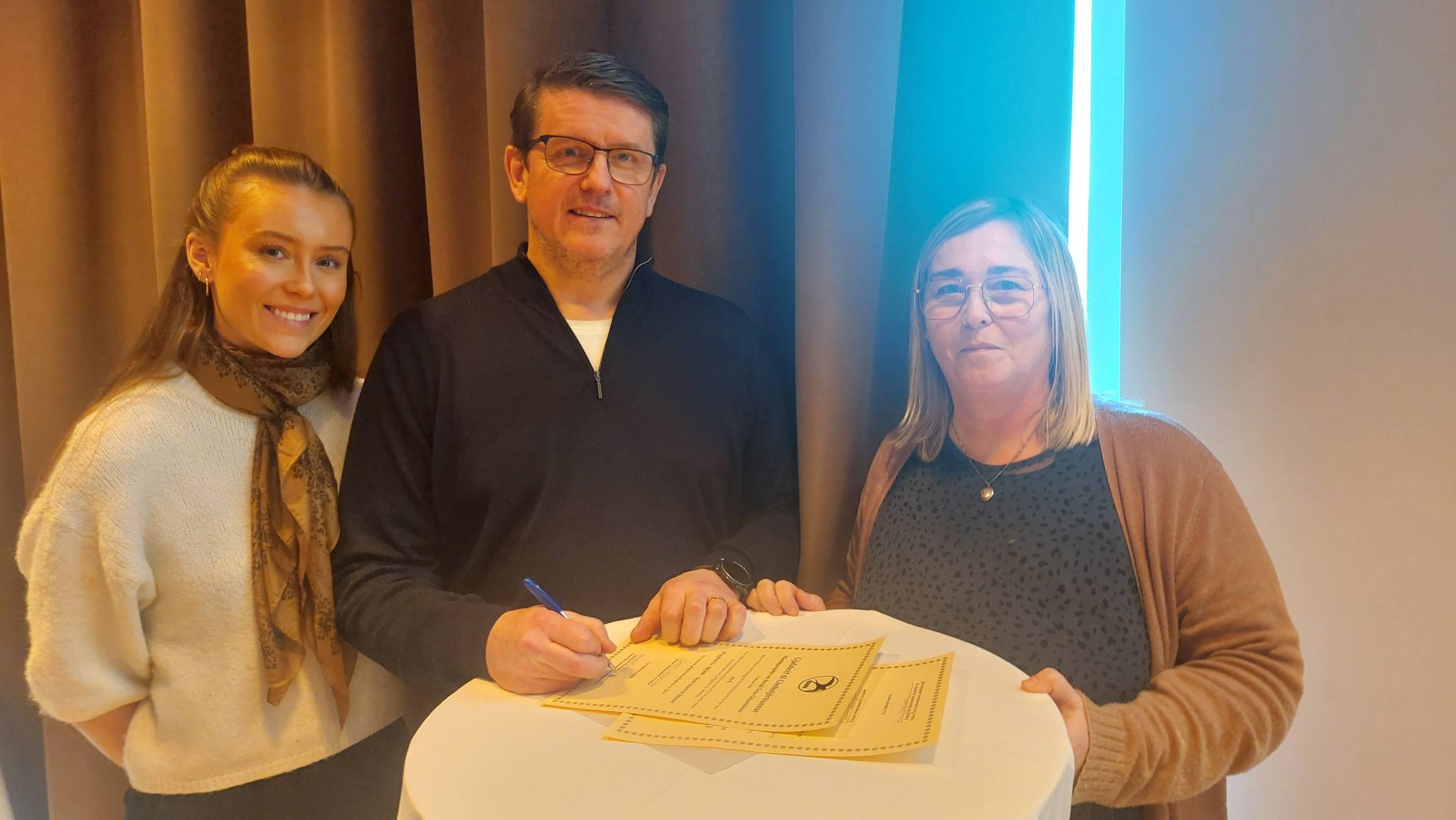 Guðrún formaður undirritar gjafabréfin. Jenný gjaldkeri og Sigríður deildarstjóri fylgjast með